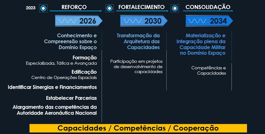 Numa segunda fase, de Fortalecimento, procura-se transformar a arquitetura das capacidades, como consequência das parcerias estabelecidas e dos resultados da participação em projetos de desenvolvimento de capacidades. A introdução gradual de novas capacidades espaciais será efetuada de forma integrada e coerente, com ênfase na maximização do produto operacional da Força Aérea.