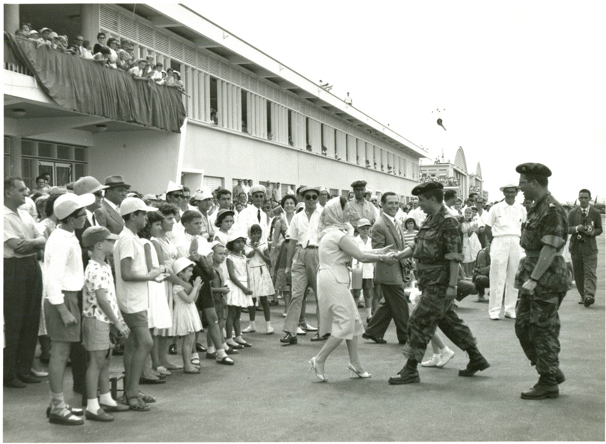 Figura 8 – Luanda, 1959. Depois de terem saltado (exercício Himba), Videira e o capelão Martins, são entusiasticamente recebidos. A presença da Força Aérea e a demonstração do salto em massa teve um tremendo impacto moralizador para a população.