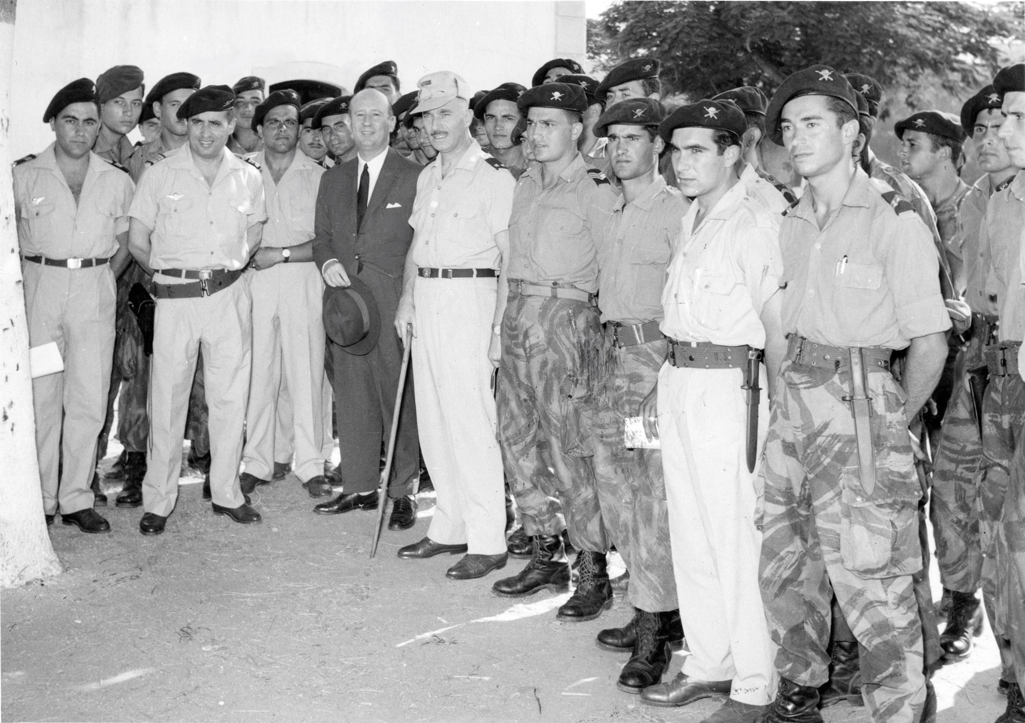Figura 9 – No Batalhão de Caçadores n.º 21, Fortaleza em Luanda, em 1962, com o Secretário de Estado da Aeronáutica e militares da unidade. Videira é o 2.º da esquerda, à frente, com cinturão e pistola.