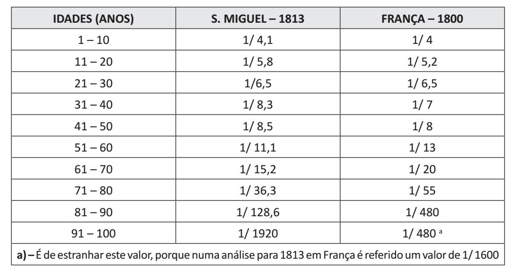 Iremos agora construir, com base nos dados fornecidos por Borges da Silva, um quadro com a repartição por grupos de idades (sexos reunidos), através do qual poderemos obter uma visão rápida da estrutura da população de S. Miguel em 1813, comparando-a com a existente em França em 1800. Embora modernamente a repartição por grupos de idade se calcule dividindo o quantitativo do grupo seleccionado pelo total da população e se multiplique por 1000, o autor em estudo faz a mesma operação inicial e referencia-se à unidade; por exemplo, no caso do grupo dos zero aos dez anos, significa que em 4,1 habitantes um tem idade entre os 0 e os 10 anos.