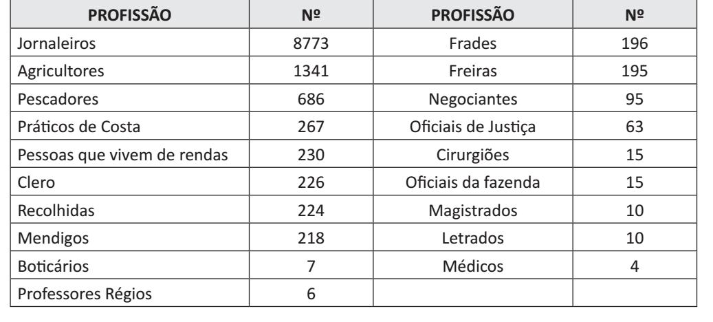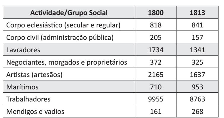 Num breve comentário, refira-se que este quadro sugere aumentos no número de marítimos e de mendigos e uma diminuição sensível no dos artistas, lavradores e trabalhadores. Tal facto poderá estar associado à estrutura da posse da terra, à emigração ou à difícil conjuntura do início do século XIX nos Açores, mas somente um estudo sistemático da demografia e dos grupos sociais neste período o poderá confirmar.