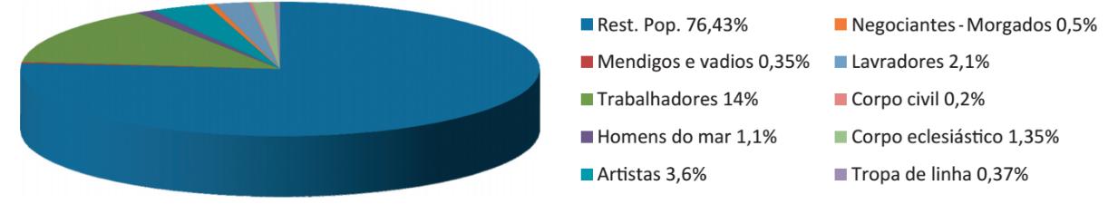 A classificação da população segundo a profissão pode ser feita sob diversos pontos de vista. Borges da Silva utiliza uma metodologia híbrida, misturando as profissões, as atividades coletivas e a hierarquia social. Assim, com base na sua relação da população com as diferentes classes da sociedade podemos construir o seguinte quadro: