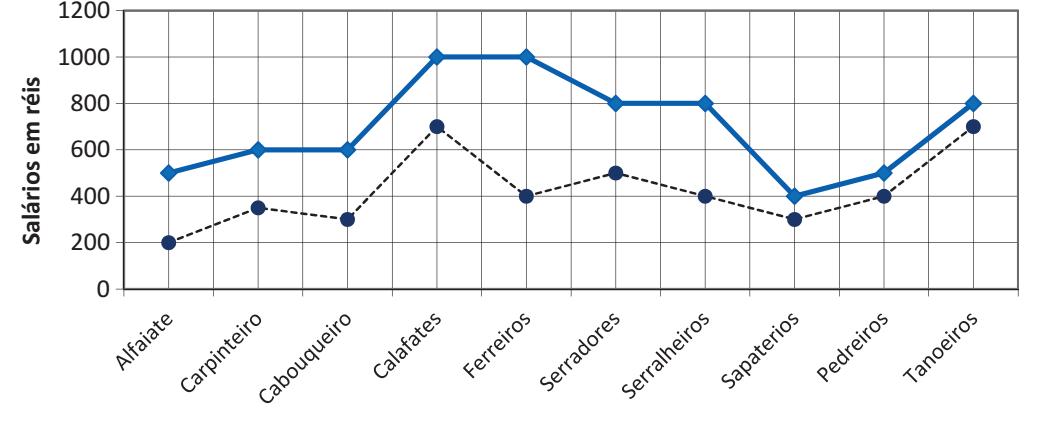 Borges da Silva elenca os diversos ofícios e mesteres (artistas) e os respectivos salários, que se podem sintetizar no seguinte gráfico: