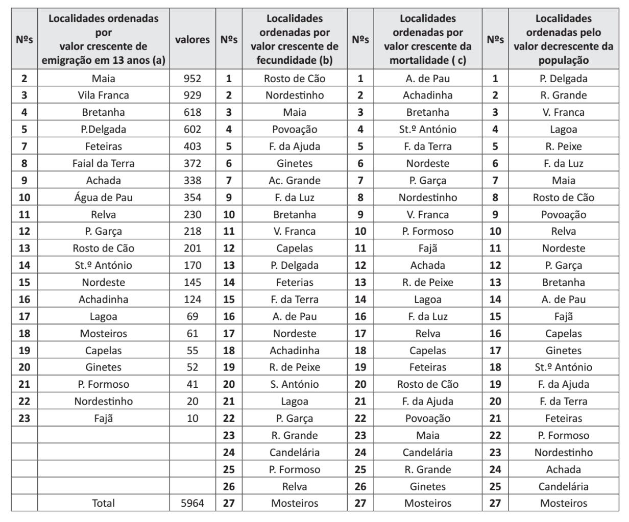 Como apresenta as localidades ordenadas pela maior fecundidade, pela menor mortalidade e pelo maior número de habitantes, a integração destes dados num só quadro poderá ter interesse para uma visão de conjunto de algumas variáveis demográficas na ilha de S. Miguel na primeira década de oitocentos.