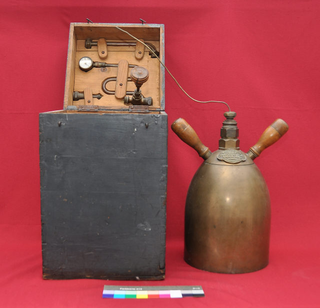 22 Destinava-se à desinfecção de habitações e espaços públicos utilizados por pessoas com doenças contagiosas, por acção do formol sobre pressão. Consistia numa botija de metal, com duas pegas de madeira, no topo da qual existia uma agulheta, para a aplicação do germicida, e uma válvula, para regular a pressão do gás. Era fabricado e comercializado pela Loja Sol, Lisboa.