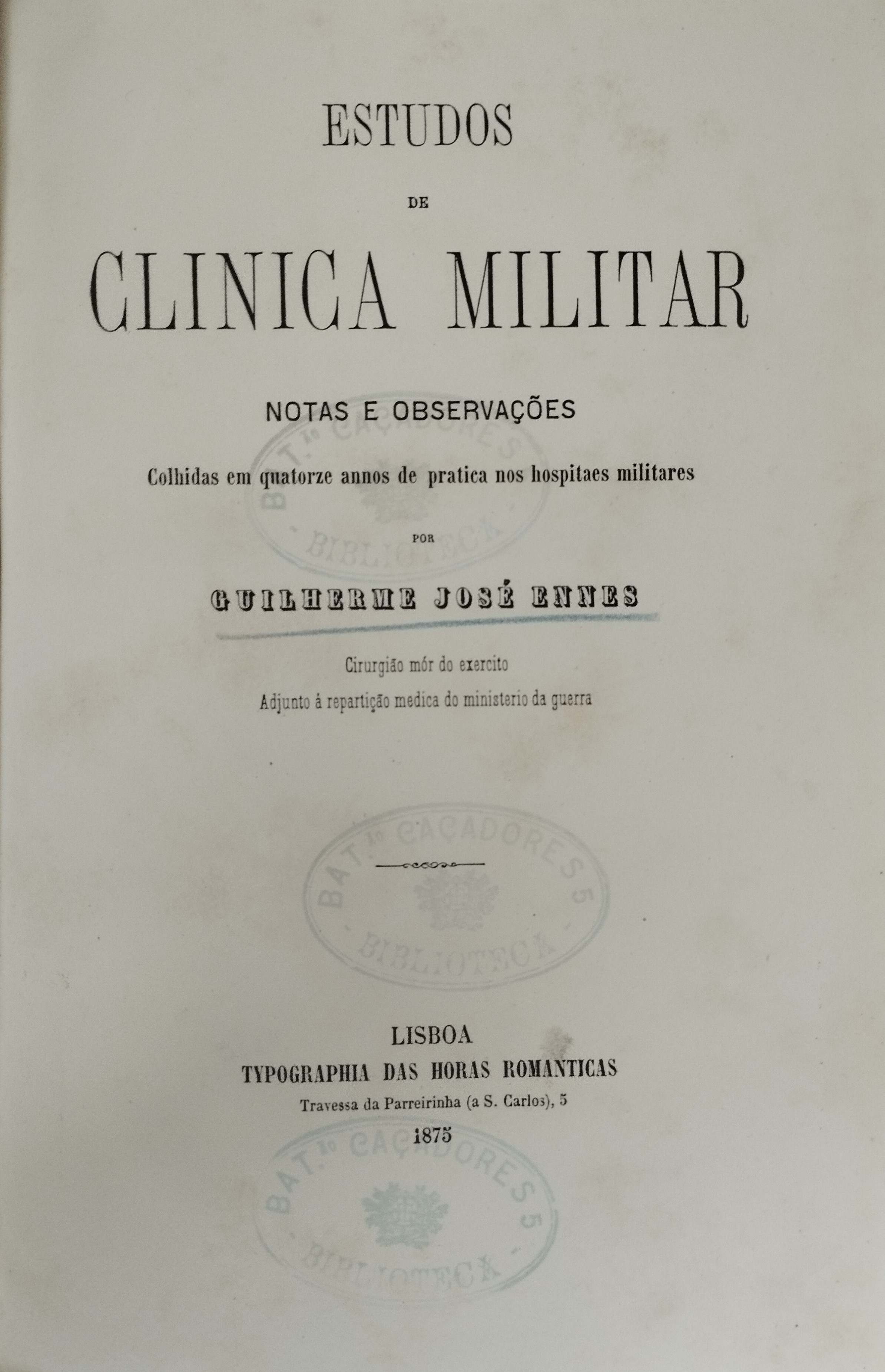 1 Dois volumes, publicados pelo Estado-Maior do Exército, em 2004. Guilherme José Ennes é aí referido, por exemplo, na p. 591 do vol. I, na sua qualidade de presidente da comissão nomeada, em 16-Dez.-1886, para estudar a remodelação do hospital militar da Estrela; na p. 82 do vol. II, a propósito de cordões sanitários e lazaretos, onde o autor diz que foi Guilherme José Ennes, com António Manuel da Cunha Belém, um dos dois “médicos militares [que] levaram a bom termo e a pleno êxito, o estabelecimento do cordão sanitário e dos lazaretos”; e nas pp. 283-4 do vol. II, onde o autor faz uma resenha biográfica de Guilherme José Ennes.
