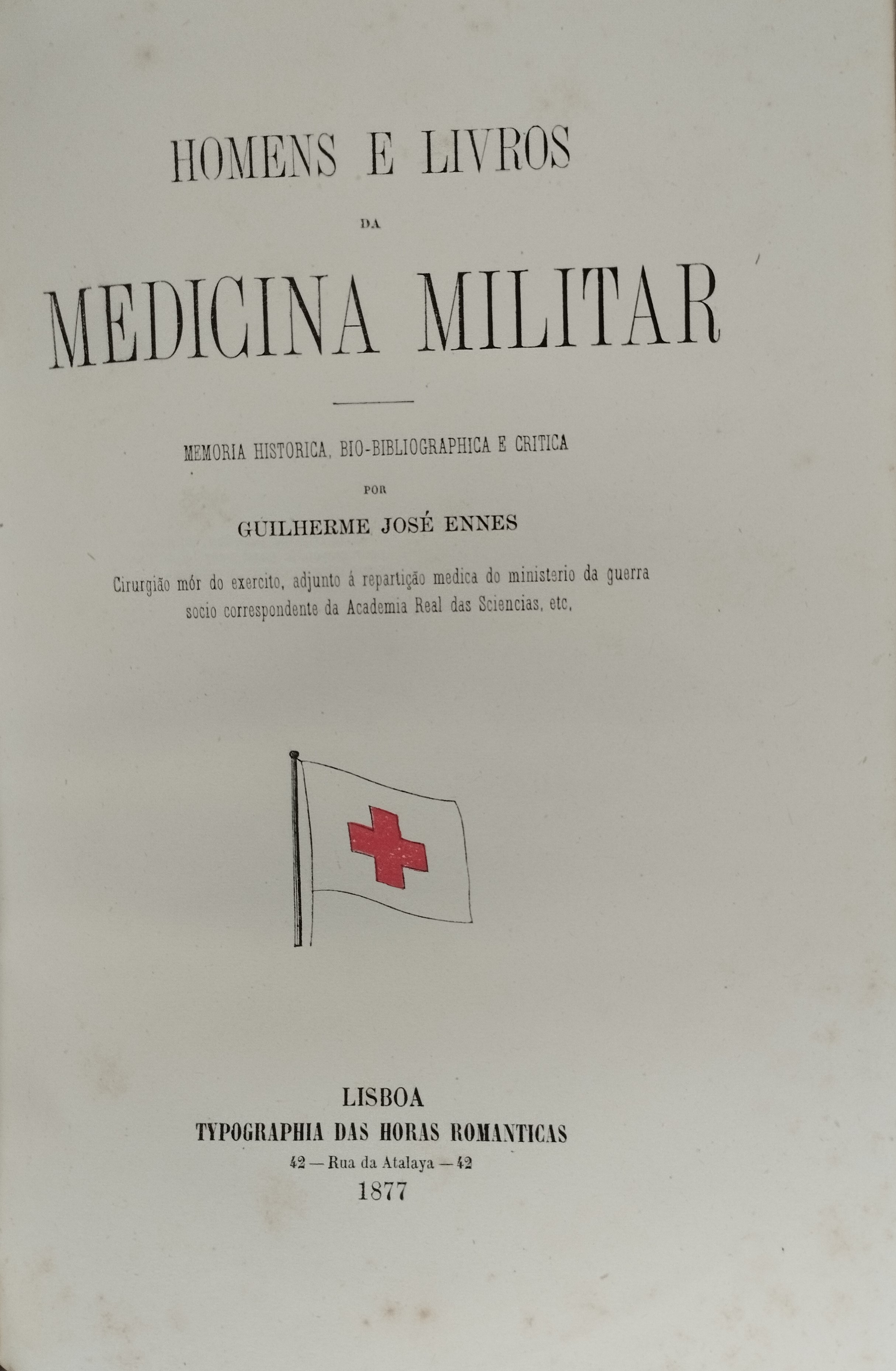 5) HOMENS E LIVROS DA MEDICINA MILITAR – MEMÓRIA HISTÓRICA, BIO-BIBLIOGRÁFICA E CRITICA, por …, Cirurgião mór do exercito, adjunto á repartição medica do ministerio da guerra, socio correspondente da Academia Real das Sciencias, etc., Typographia das Horas Romanticas, Lisboa, 1877. Dim.: 21 cm (alt.); 205 pp.
