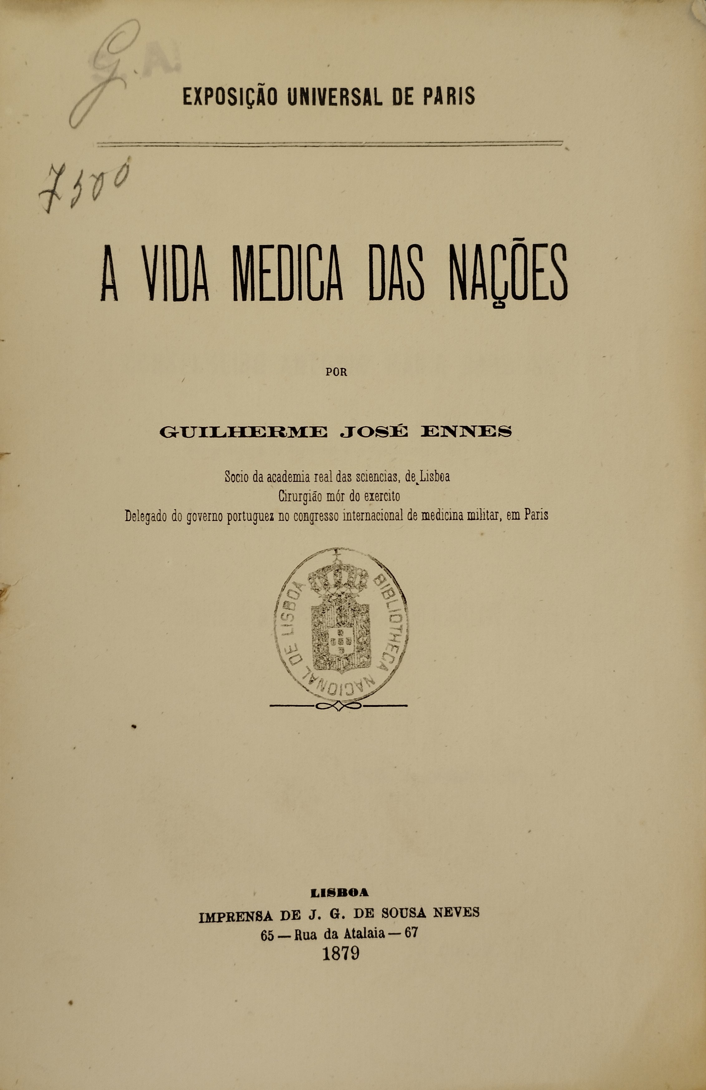 GUILHERME JOSÉ ENNES (1839-1920) – licenciado pela Escola Médica-Cirúrgica de Lisboa, onde defendeu o respectivo Acto Grande em 30-Jul.-1859, com a dissertação inaugural Abcessos em geral (cfr. 1), infra), que obteve aprovação plena e louvor, a 14-Nov. desse mesmo ano alistou-se no exército como Cirurgião-ajudante do 3.º Regimento de Artilharia. Passou os primeiros anos da sua vida oficial em Viana do Castelo e depois em Setúbal, como Cirurgião-ajudante de Artilharia n.º 3 e de Caçadores n.º 1, sendo transferido para a guarnição de Lisboa, em 1864, como Cirurgião-ajudante de Infantaria n.º 1, distinguindo-se, então, no Hospital Militar da Estrela. Datam desta altura as relações com António Manuel da Cunha Belém, que resultariam numa estreita e profícua colaboração profissional para o resto da vida. Em 1871, pela ordem do Exército n.º 10, foi encarregado, como secretário, de fazer parte da comissão para a elaboração para os hospitais militares de novo formulário de medicamentos, o mesmo tendo acontecido, sendo já Cirurgião-mor, em 1881, por nomeação e portaria de 7-Jun. desse ano. Fez parte, como secretário, da comissão nomeada para reformar o regulamento geral do serviço de saúde do exército17, e de várias outras comissões e providências. Foi promovido a Cirurgião-mor por decreto de 2-Abr.-1872. Em Janeiro de 1875, entrou, como adjunto, na 6.ª Repartição do Ministério da Guerra e compilou e publicou, então, os Estudos de Clínica Militar (cfr. 3), infra). Em 1877, publicou, ainda Homens e livros da medicina militar (cfr. 5), infra), que, juntamente, com o anterior, abriu-lhe as portas da Academia das Ciências. Dá-se ao estudo da remodelação do material sanitário, que estava então na ordem do dia de todos os exércitos, e do modo como se desempenhou d’esta iniciativa, fala a portaria de 25 de Setembro 1874, em que é louvado pela boa disposição, arranjo e melhoramentos do material de ambulância, e mais segunda vez elogiado pelos importantes aperfeiçoamentos introduzidos no referido material, em resultado dos seus perseverantes estudos e aplicação (cfr. 2), infra). Em 1877, iniciou a publicação do jornal quinzenal Gazeta dos Hospitais Militares (cfr. 6), infra), publicada até 1884, quando outros deveres e encargos de novos serviços o impossibilitaram de continuar a assiduidade da redacção. Em 5-Ago.-1878, foi encarregado de tomar parte no Congresso Internacional de Higiene e Medicina Militar de Paris, de cujos trabalhos resultou A vida médica das nações (cfr. 8), infra). Nomeado em 30-Ago.-1879 para assistir ao Congresso Periódico Internacional de Ciências Médicas de Amsterdão, apresentou aí a memória Nouveaux usages médicaux du pétrole (cfr. 9), infra), transcrita nas actas do mesmo congresso, onde teve a presidência de honra de uma das secções, e trouxe os elementos para publicar, em colaboração com Cunha Belém, o volume Clarões e reflexos do progresso médico (cfr. 10), infra). Em 1880, impedido por doença de estar presente no Congresso de Higiene de Turim, enviou a este a memória Nos Casernes (cfr. 11), infra), no qual defendia a adopção em Portugal das construções do sistema Tollet. Em 19-Jul.-1881, foi nomeado representante especial do Ministério da Guerra junto do Congresso Médico de Londres, ao qual apresentou duas memórias, ambas transcritas nas actas: La désinfection du champ de bataille e La chasse aux trichines (cfr. 12), infra). Em 28-Ago.-1882, foi nomeado representante do Ministério da Guerra no Congresso de Higiene de Genebra, e aí apresentou duas notas, transcritas nas actas do mesmo congresso: Écoles d’infirmiers e Mortalité dans les armées (cfr. 13), infra). Finalmente, em 1887, foi nomeado representante especial do Ministério da Guerra ao Congresso de Higiene de Viena, e para ele levou a memória La prophylaxie internationale du choléra en Portugal (cfr. 17), infra), em colaboração, e dele trouxe os apontamentos que resultaram, em colaboração também, no volume Afirmações e dúvidas sobre os últimos progressos da hygiene (cfr. 18), infra), publicado em 1888. Tomou parte, ainda, como delegado do Ministério da Guerra na conferência da Cruz Vermelha em Karlsruhe (1887), de que resultou um relatório publicado nesse mesmo ano (cfr. 16), infra). Em 1881, foi nomeado Subchefe da 6.ª Repartição do Ministério da Guerra, deixando este lugar só quando, a 4-Abr.-1888, foi promovido a Cirurgião de Brigada e colocado na direcção do Hospital de Chaves. Foi nomeado, por Portaria de 2-Jun.-1883 membro da comissão de reforma e transformação do material sanitário, e por Portaria de 16-Dez.-1886 foi nomeado presidente da comissão encarregada de propor as reformas higiénicas de que necessitava o hospital militar permanente de Lisboa e “D’essa commissão nasceram as duas bellas enfermarias abarracadas, da cerca do convento da Estrella, que se podem mostrar ao estrangeiro, como modelo de todas as conquistas hygienicas, em materia de construcção”18. Em 1884, quando o cólera, invadindo a Espanha, ameaçou Portugal, Guilherme José Ennes foi incumbido de organizar o primeiro lazareto de fronteira, em Elvas, e depois o de Vilar Formoso. Por Portaria do Ministério do Reino, de 15-Nov.-1885, foi nomeado Inspector dos Lazaretos, e findo o serviço, que durou até Fevereiro de 1886, publicou, em colaboração com Cunha Belém, Os lazaretos terrestres de fronteira (cfr. 15), infra), que eram o relatório desses serviços. Por Portaria de 1-Jul.-1890, sob nova ameaça de cólera, foi confirmado no lugar de inspector dos lazaretos, e terminada a campanha da defesa sanitária, foi exonerado deste lugar a seu pedido, por Portaria de 11-Dez. do mesmo ano, e louvado pelos serviços que prestou no desempenho do mesmo cargo. Em 1891, assumiu a direcção do Hospital da Estrela. Nomeado vogal da Junta Consultiva de Saúde Pública do Reino, em 1884; membro do Conselho