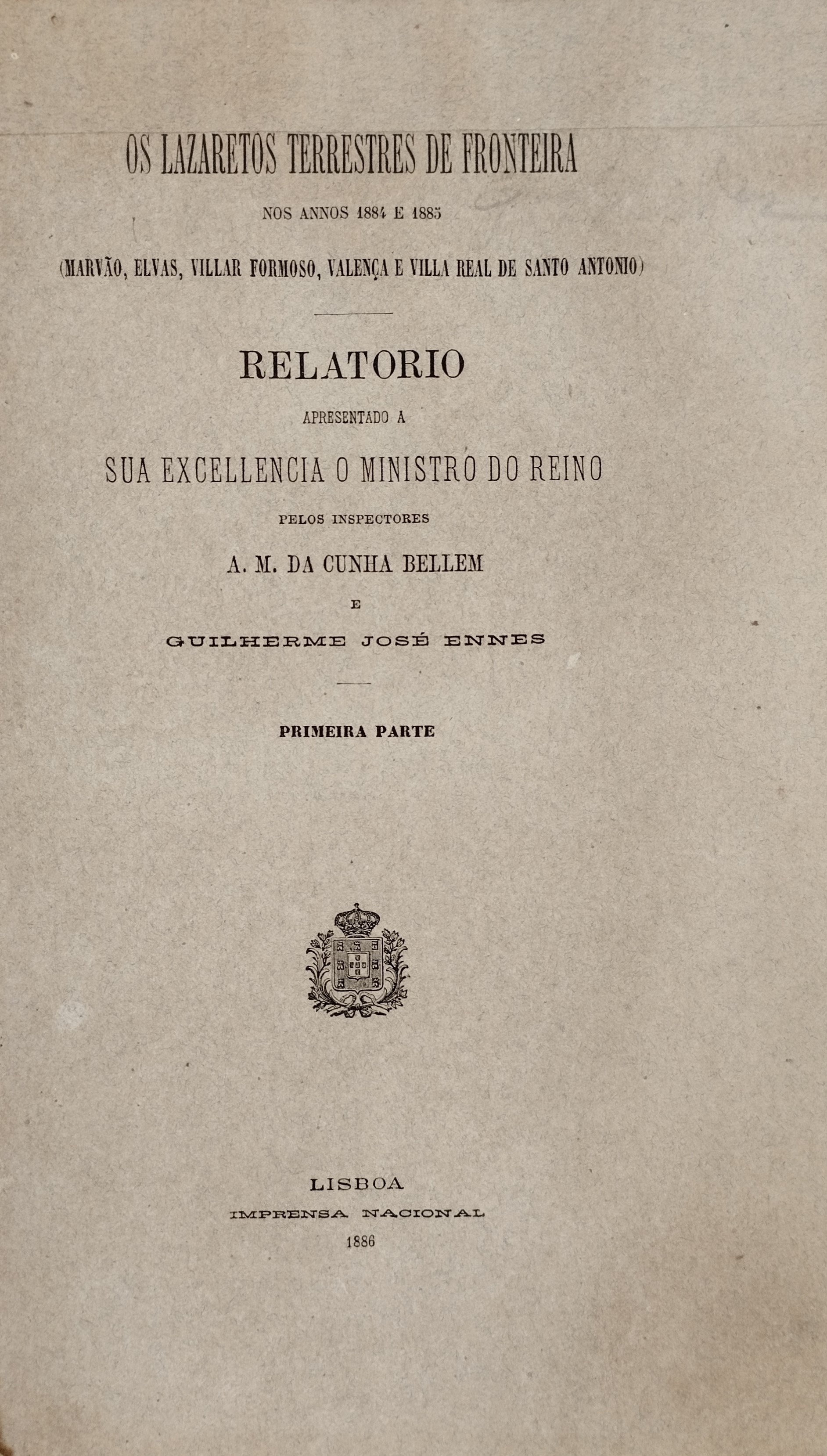 15) OS LAZARETOS TERRESTRES DE FRONTEIRA NOS ANOS 1884 E 1885 [E 1885 E 1886]: (MARVÃO, ELVAS, VILLAR FORMOSO, VALENÇA E VILLA REAL DE SANTO ANTÓNIO): RELATÓRIO APRESENTADO A SUA EXCELLENCIA O MINISTRO DO REINO PELOS INSPECTORES A. M. DA CUNHA BELLEM E …, Primeira Parte, Segunda Parte, e Appendice, Imprensa Nacional, Lisboa, 1886. Dim.: 22,5 cm (alt.); 3 vls. respectivamente de 244 (p. 244 numerada 501), 324, e 154+VI pp., o Apêndice ainda com 12 estampas referentes a cada um dos Lazaretos tratados, aos Hospitais de Doenças Infecciosas, e ao Serviço do Cordão Sanitário.