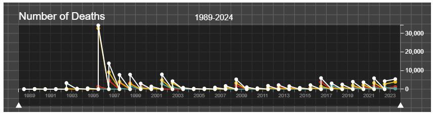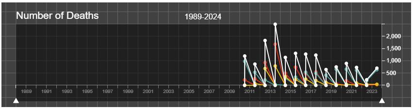 De modo a realizarmos uma leitura acerca da efetividade das 11 operações de paz em curso, buscaremos, como apontado acima, avaliar brevemente a consecução do mandato das missões, visando entender se os objetivos propostos vêm sendo alcançados. Tendo em vista a variedade de tarefas previstas, analisaremos cada caso recorrendo a dados quantitativos e qualitativos. No primeiro caso, utilizaremos dados do Uppsala Conflict Data Program para evidenciar o número de fatalidades. Essa base trabalha com dados de 1989 a 2024, de modo que manteremos esse intervalo de tempo para todos os casos. A linha do tempo que quantifica as fatalidades, no site da base, permite também observar os picos de violência ao longo desses anos.