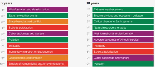 Julgo adequado observar quais os Riscos em 2 e/ou 10 anos identificado pela Equipe WEF (2025), conforme seguinte, que afetam a continuidade dos negócios da BIDS: