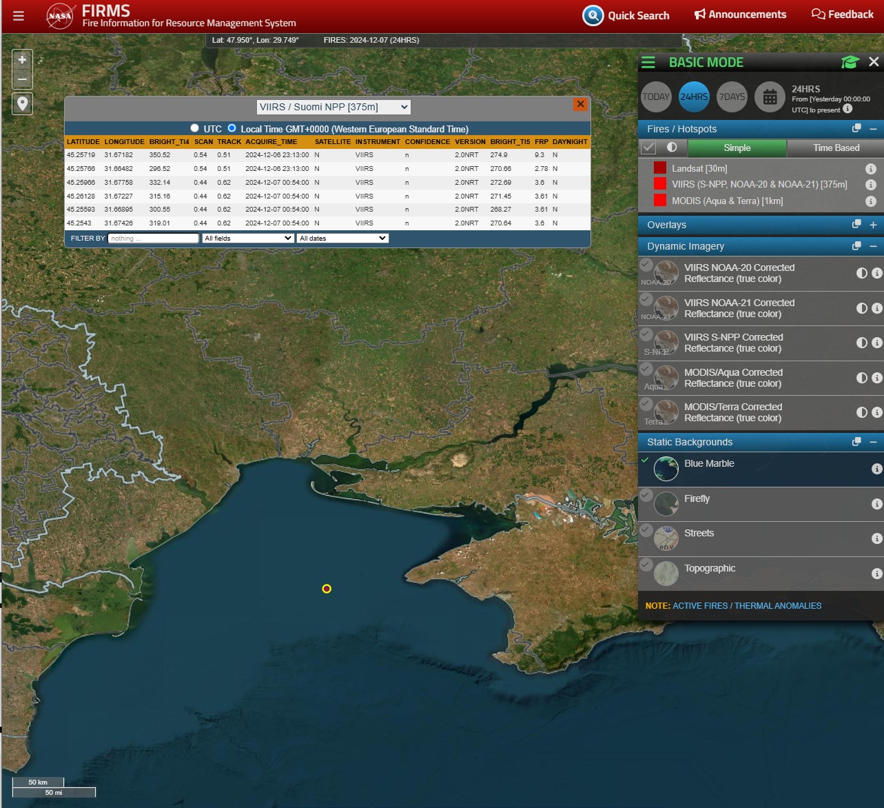 Um caso prático de uso, pelo colectivo independente português “Espada & Escudo”, a 7 de Dezembro de 2024, que recorreu ao sistema NASA FIRMS para identificar o ataque, pelas forças da Marinha da Ucrânia, a plataformas “offshore” de exploração de gás natural no Mar Negro, anexadas e nacionalizadas pela Federação Russa, ao largo da costa ocidental da Crimeia (E&E, 2024b).