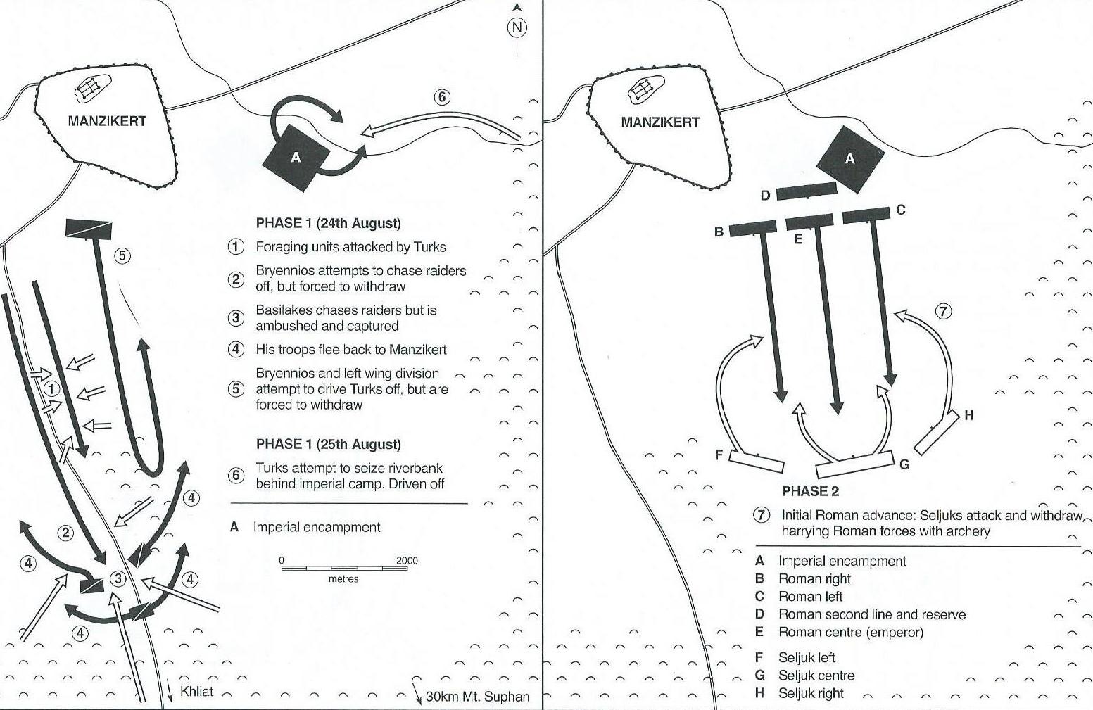 Figura 3 – Primeira metade: os combates na estrada para Khliat (24 de Agosto) e na margem do ribeiro (25 de Agosto). Segunda metade: ordens de batalha dos exércitos bizantino e turco no início da Batalha de Manzikert (26 de Agosto).