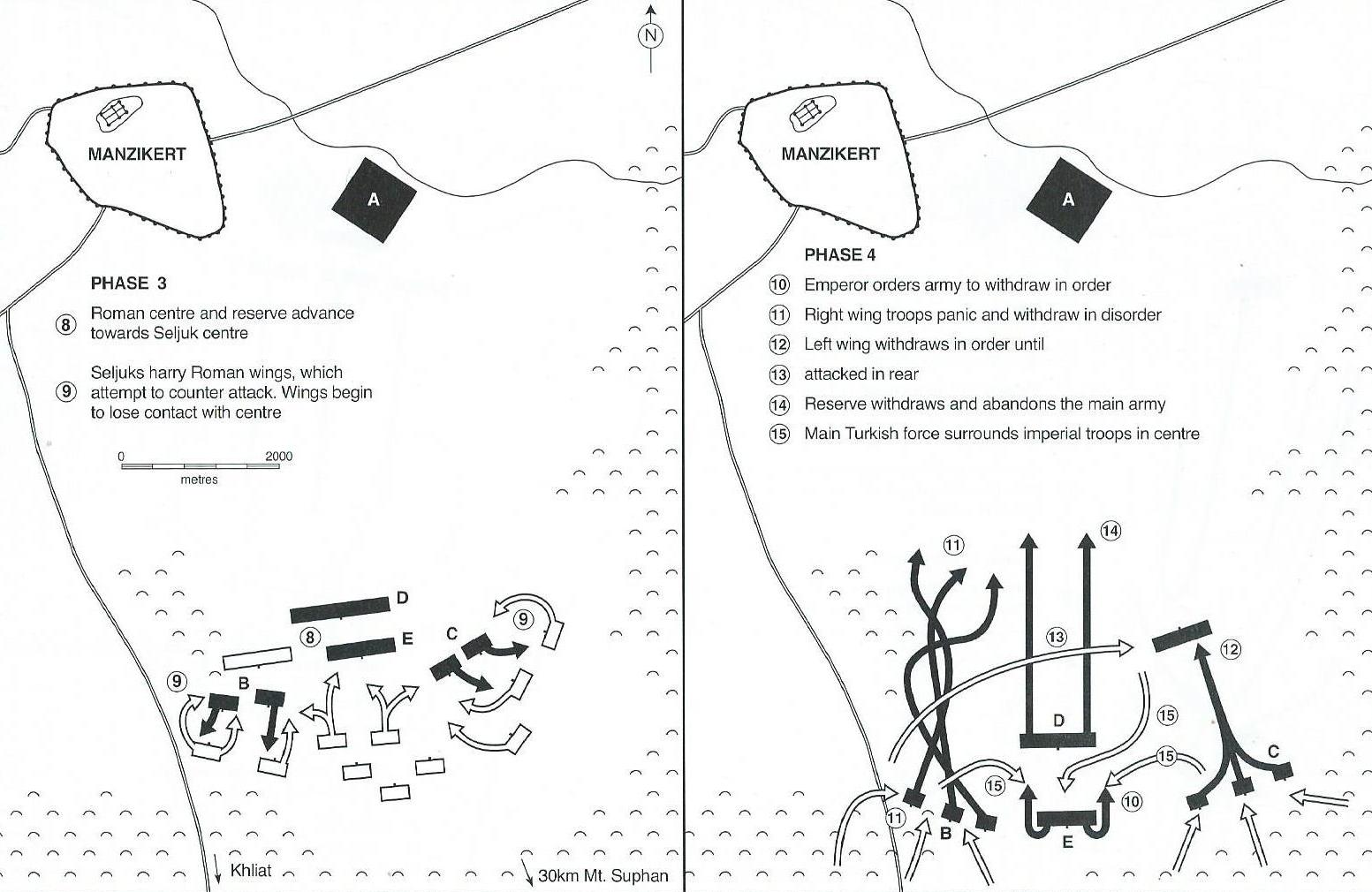 Passado o acampamento turco a meio da tarde, o centro romano alcançou o terreno mais áspero, já perto da cadeia montanhosa, com relativamente poucas baixas. Porém, nas alas, começava a perder-se o controlo da situação. Os chuveiros de flechas causavam um grande incómodo às tropas bizantinas, levando a que várias unidades, agastadas por aqueles ataques, descurassem cada vez mais a sua disciplina tática inicial para carregarem abertamente sobre as alas turcas. Por seu turno, estas forças, à boa maneira dos povos das estepes, simulavam retiradas para o terreno acidentado (que conheciam bem) para, depois, concretizarem as suas emboscadas – veja-se a figura 4 (primeira metade).