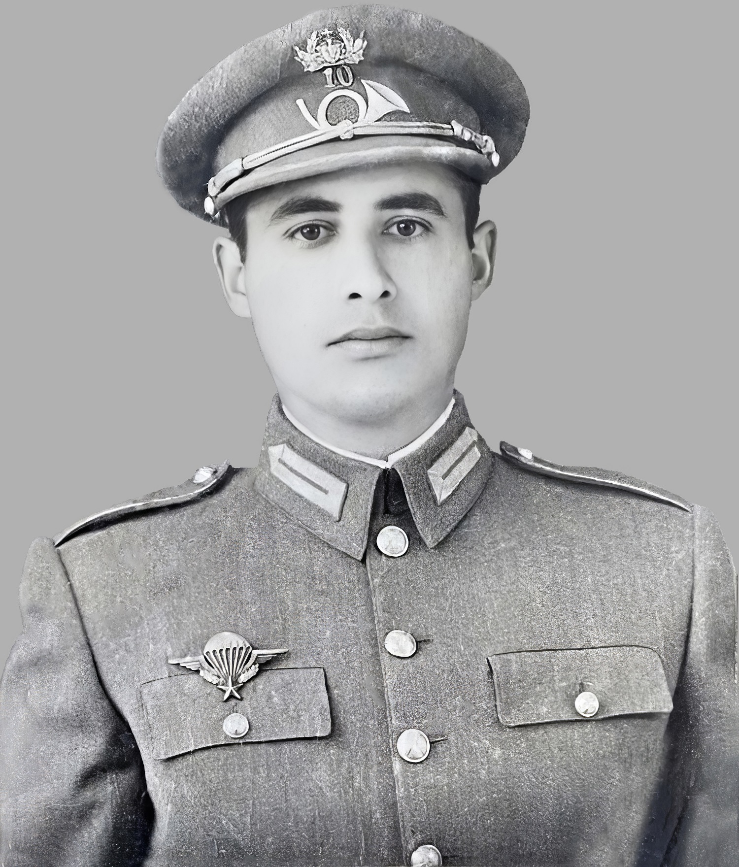 Figura 3 – O capitão Videira, de Caçadores 10, em 1951, depois de regressar de França, ostenta no uniforme o “brevet militaire de parachutisme”.