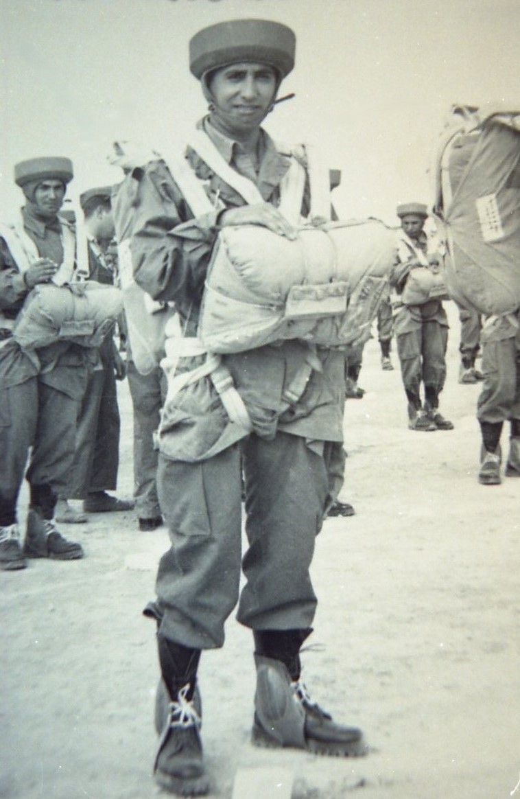 Figura 4 – Martins Videira, capitão, em Alcantarilla, equipado para saltar. Todo o fardamento e equipamento (paraquedas, capacete, botas e protecções) é espanhol.
