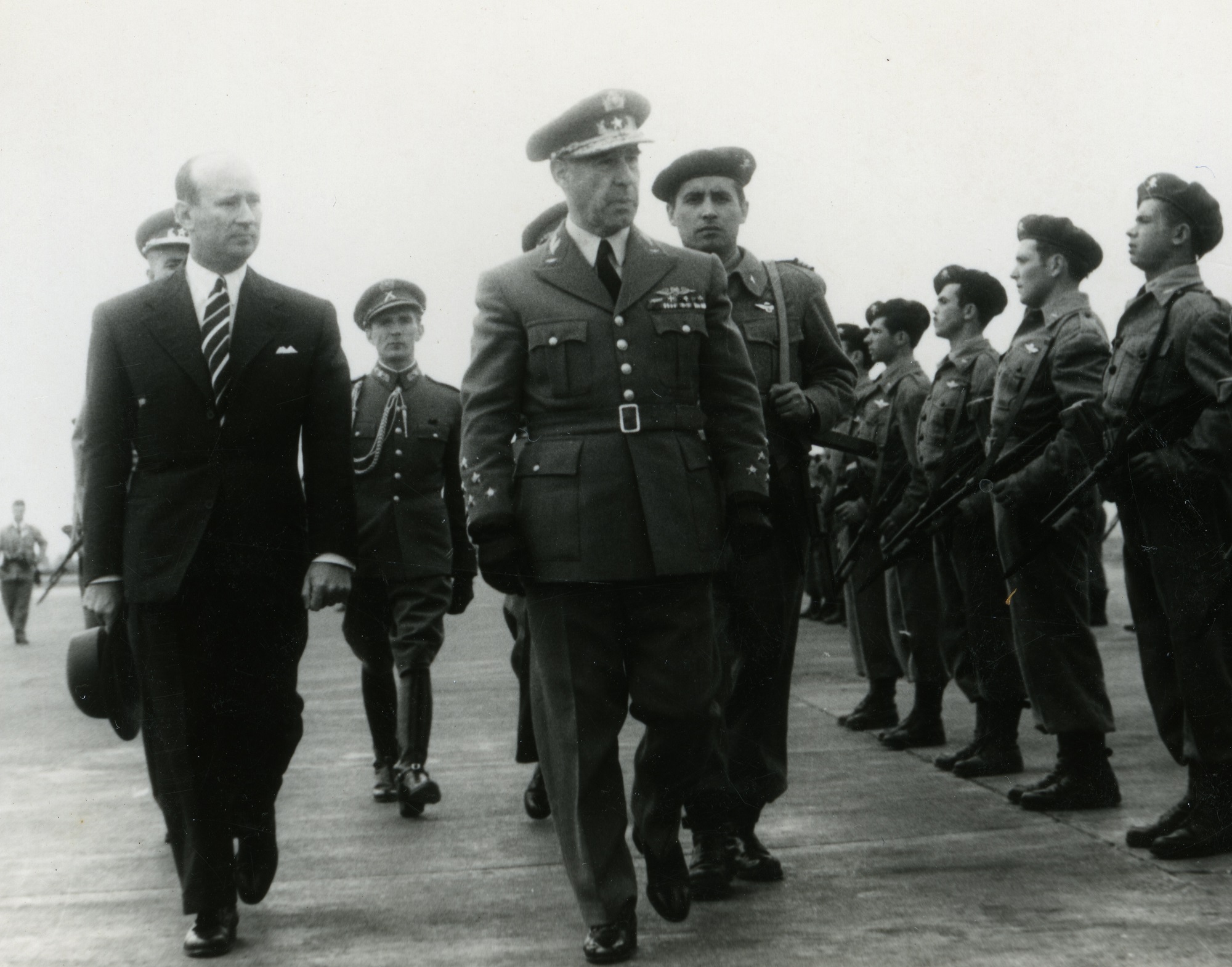 Figura 5 – Em 1 de Julho de 1956, Dia da Força Aérea, revista ao BCP pelo Presidente da República General Craveiro Lopes, acompanhado pelo Subsecretário de Estado da Aeronáutica, Tenente-Coronel Kaúlza de Arriaga e pelo Capitão Martins Videira, seu comandante.