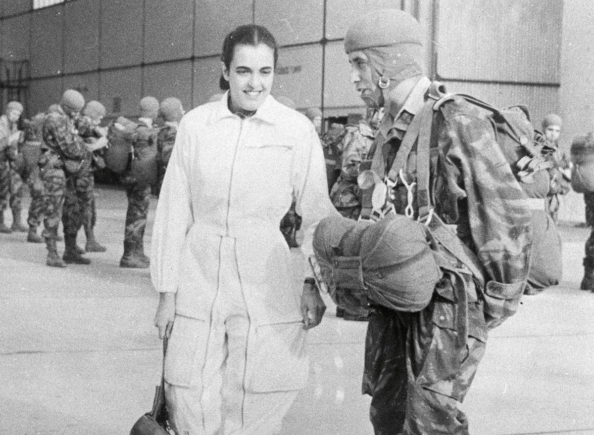 Figura 6 – Em Tancos na Base Aérea n.º 3, 1957 (?), Martins Videira, equipado para um salto de treino, troca impressões com Isabel Rilvas (1935-2025), a primeira paraquedista civil portuguesa.
