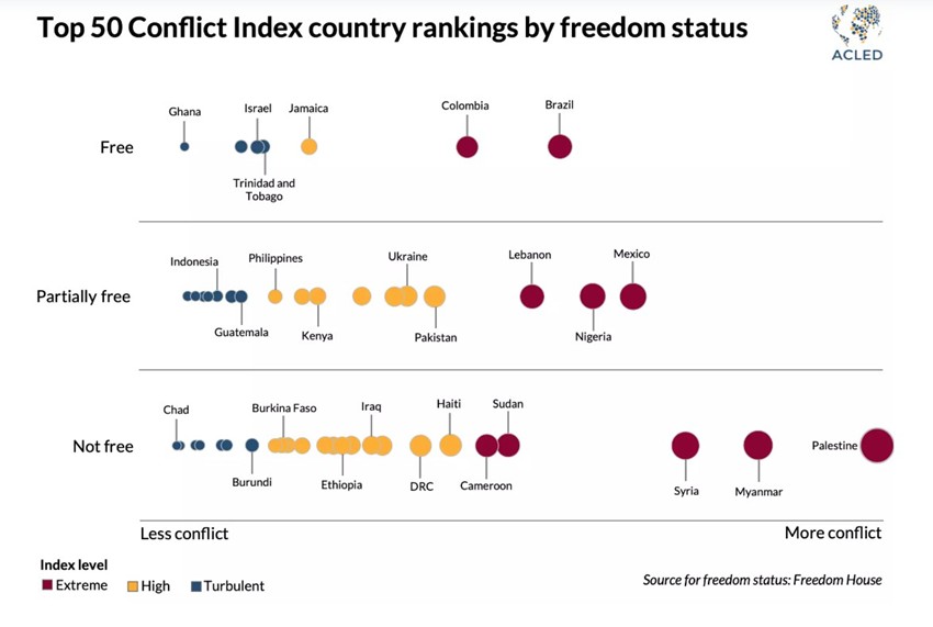 Figura 4 – Os 50 maiores conflitos, indexados pelos Países e suas classificações de liberdade.