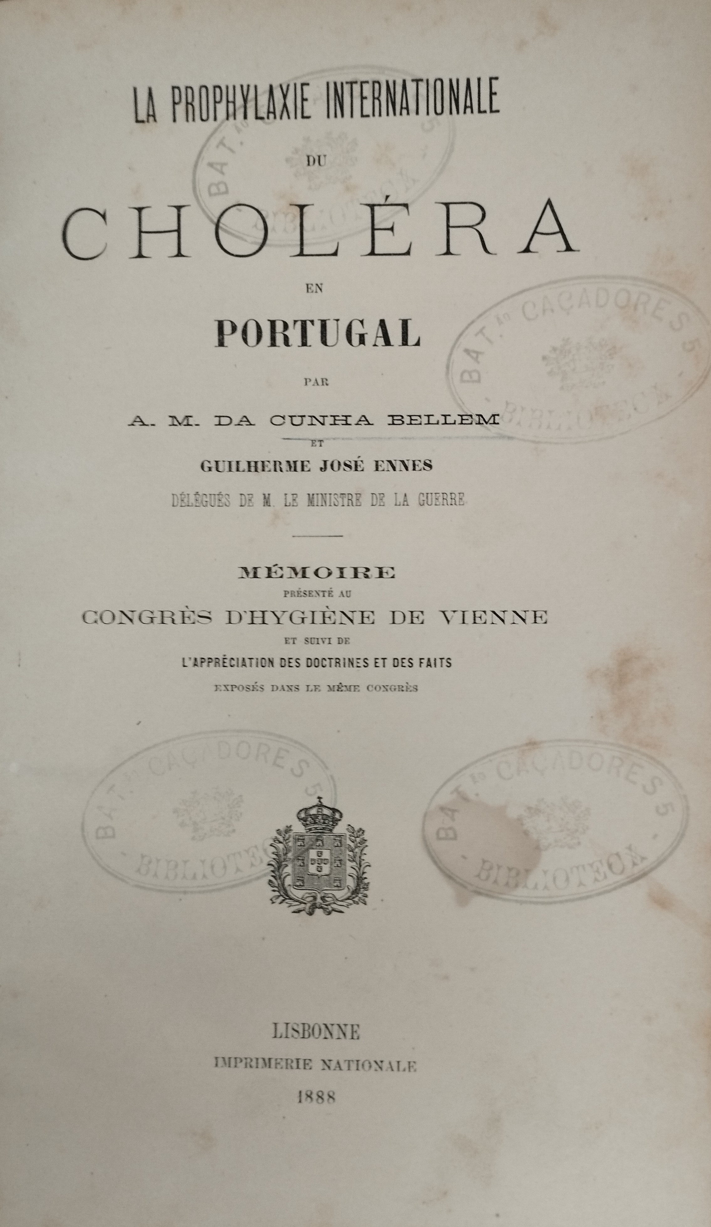 17) LA PROPHYLAXIE INTERNATIONALE DU CHOLÉRA EN PORTUGAL, par A. M. da Cunha Bellem et …, Délégués de M. le Ministre de la Guerre. Mémoire présenté ao Congrès d’Hygiène de Vienne et suivi de l’Appréciation des Doctrines et des Faits Exposés dans le même Congrès, Imprensa Nacional (Imprimerie Nationale), Lisboa, 1888. Dim.: 22 cm (alt.); 145 pp.