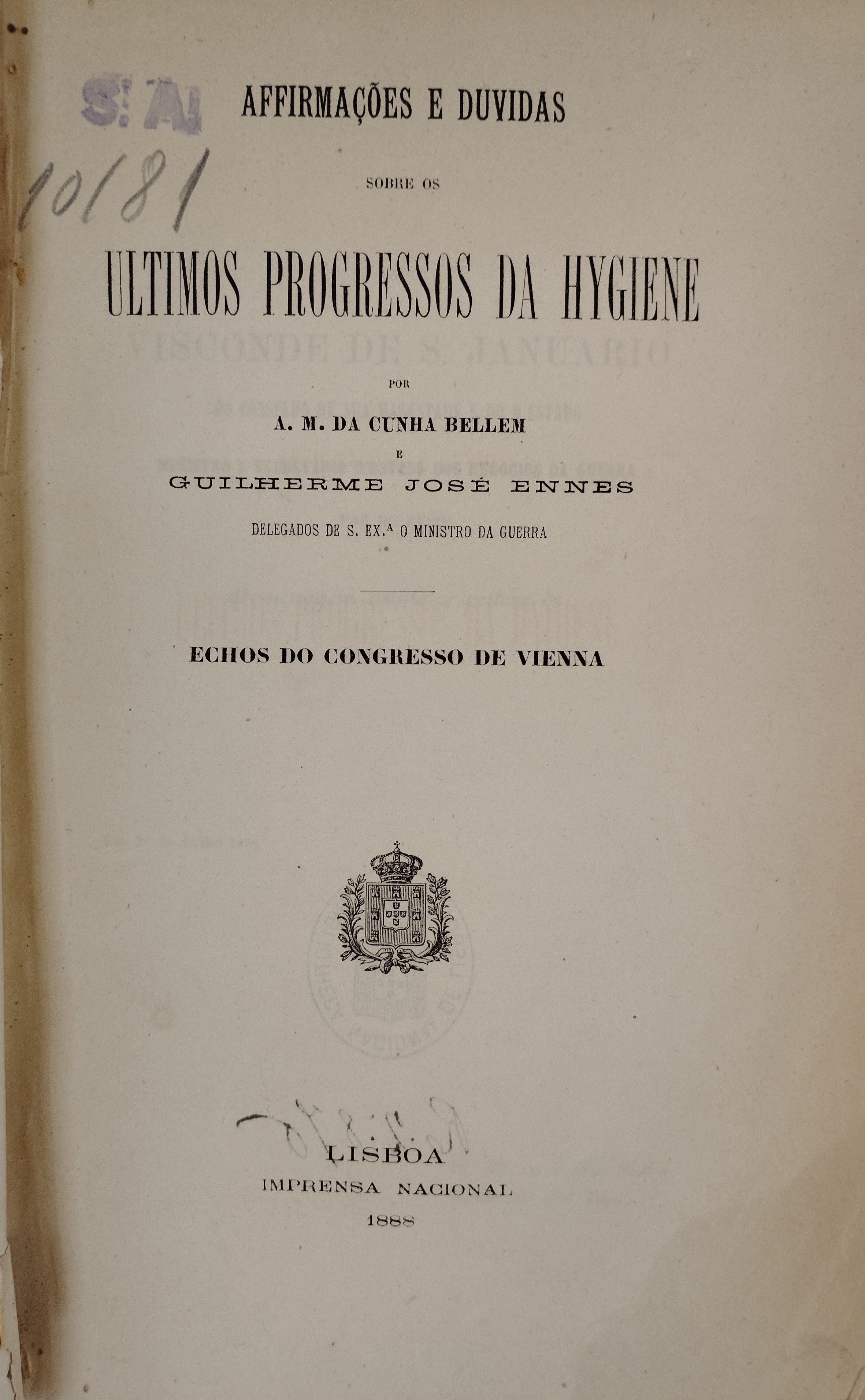 18) AFFIRMAÇÕES E DUVIDAS SOBRE OS ULTIMOS PROGRESSOS DA HYGIENE: ECHOS DO CONGRESSO DE VIENNA, por A. M. da Cunha Bellem e …, Delegados de S. Ex.ª o Ministro da Guerra, Imprensa Nacional, Lisboa, 1888. Dim.: 22,5 cm (alt.); VI+376 pp.