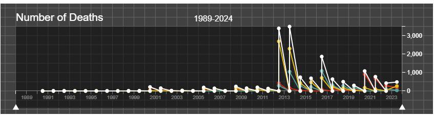 De modo a realizarmos uma leitura acerca da efetividade das 11 operações de paz em curso, buscaremos, como apontado acima, avaliar brevemente a consecução do mandato das missões, visando entender se os objetivos propostos vêm sendo alcançados. Tendo em vista a variedade de tarefas previstas, analisaremos cada caso recorrendo a dados quantitativos e qualitativos. No primeiro caso, utilizaremos dados do Uppsala Conflict Data Program para evidenciar o número de fatalidades. Essa base trabalha com dados de 1989 a 2024, de modo que manteremos esse intervalo de tempo para todos os casos. A linha do tempo que quantifica as fatalidades, no site da base, permite também observar os picos de violência ao longo desses anos.