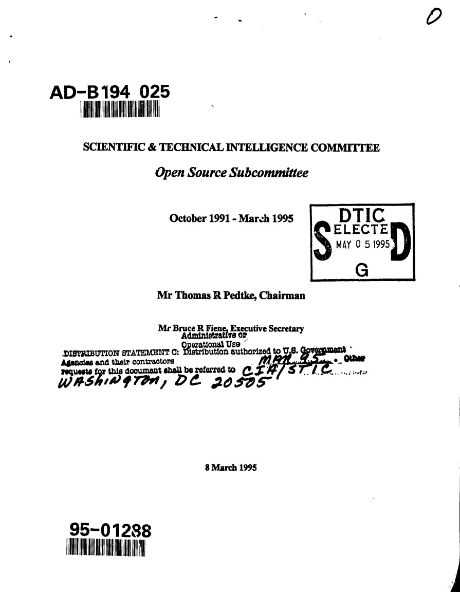 Central Intelligence Agency (CIA), STIC-OSS (1995) Scientific & Technical Intelligence Committee – Open Source Subcommittee, CIA/STIC 012-97 ltr., 3 April 1997, ADB194025, Washington, D.C.