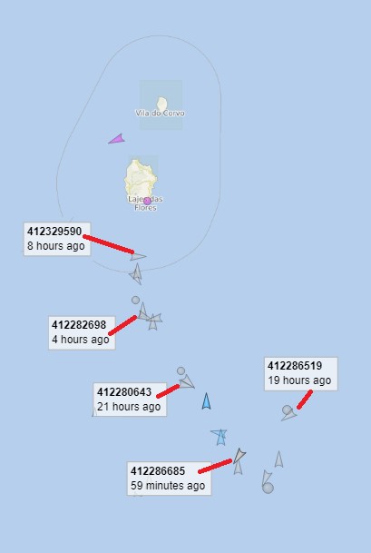 Figura 4 – Uso da plataforma aberta "Vessel Finder" pela colectivo independente português "Espada & Escudo" em análise sobre o Teatro de Operações da Região Autónoma dos Açores, Ilha das Flores.