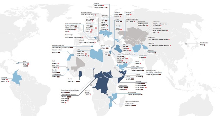 O mapa (figura 5) dá-nos uma perspetiva dos países com conflitos, alguns já na situação de guerra, em cujos territórios existem operações de paz.