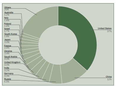 Nele podemos constatar que o investimento correspondente aos cinco primeiros países – EUA, China, Rússia, Alemanha e Índia – corresponde a 61% do investimento global em defesa.